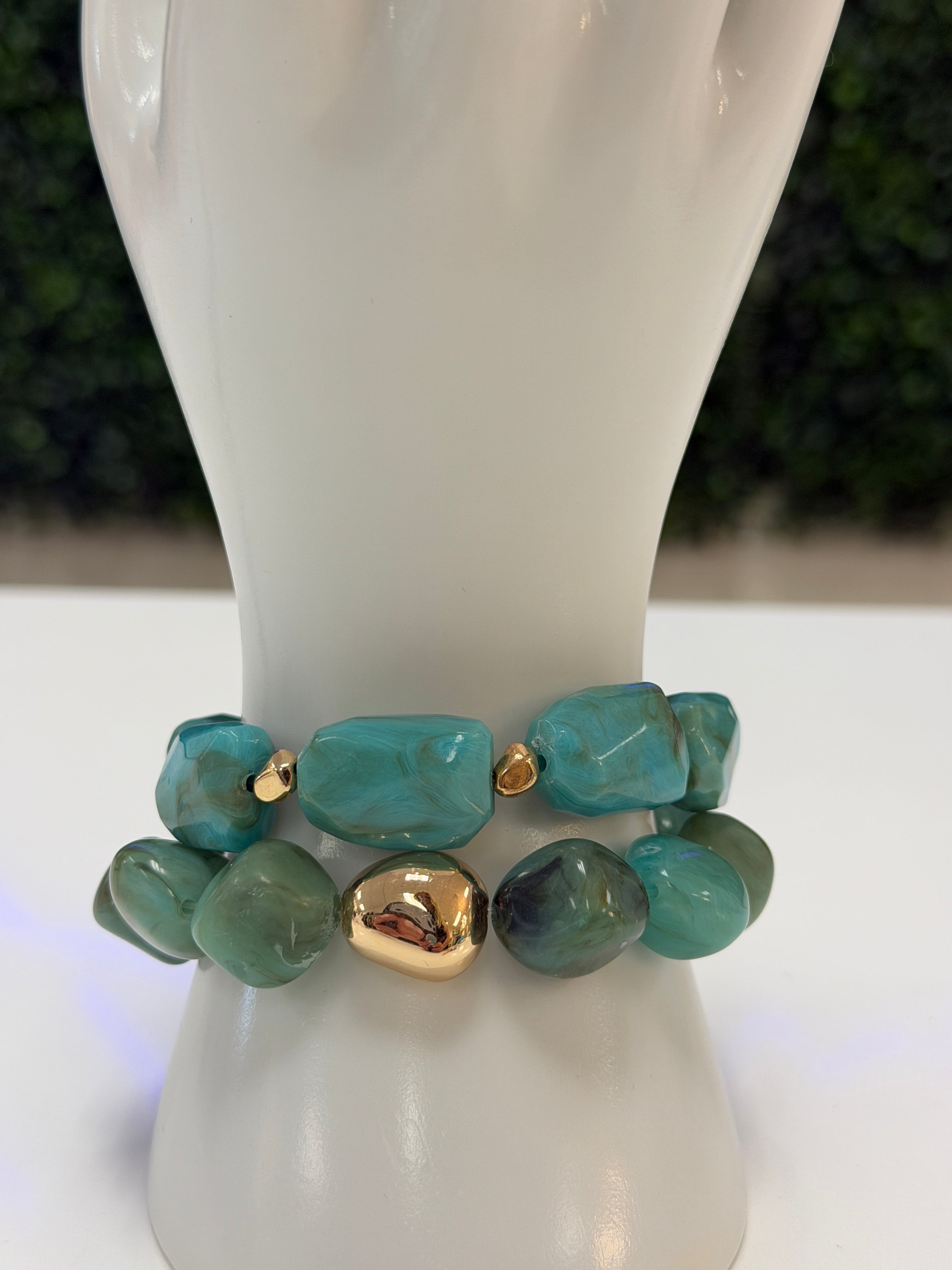 Turn heads with this stunning turquoise bracelet stack featuring chunky marbled beads and gold accents ✨. The mix of ocean-hued resin stones and gleaming metallic detail gives this set a bold yet sophisticated touch — perfect for dressing up your everyday look or adding polish to a night out.