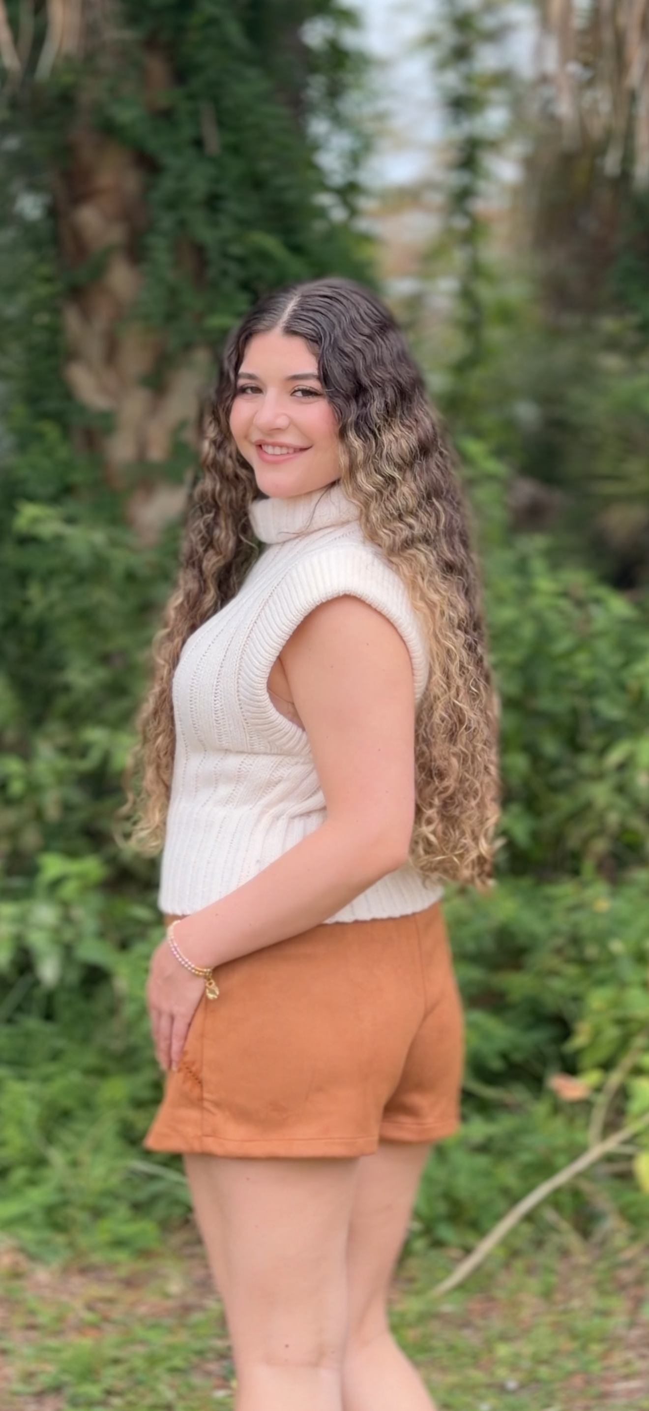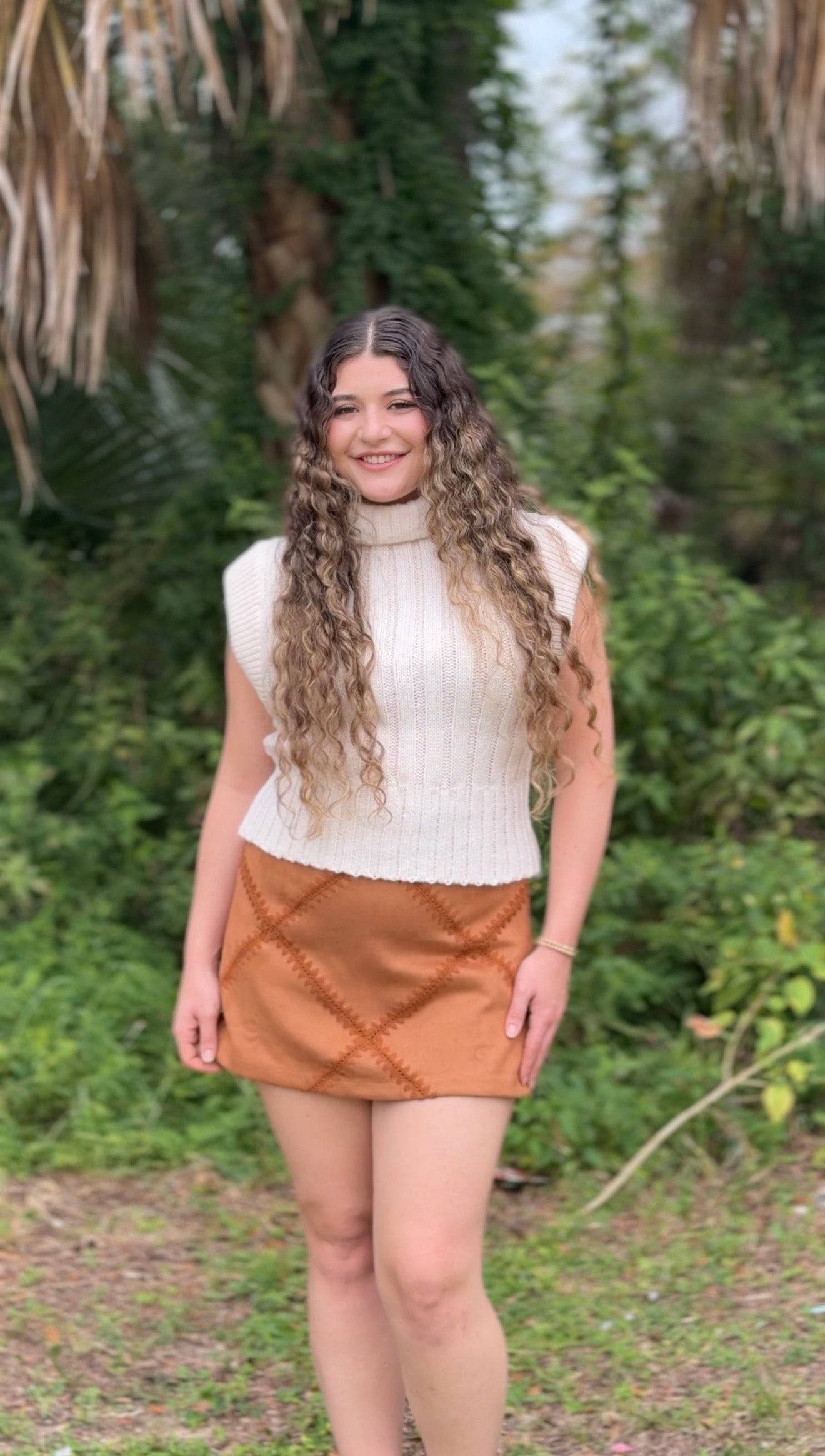 Effortlessly chic with a hint of retro flair, the Caden Skort blends the look of a mini skirt with the ease and comfort of shorts. Crafted in a soft faux suede, this piece features stitched diamond patchwork detailing across the front that adds texture and a western-inspired vibe. From the back, the tailored short silhouette ensures coverage without compromising style.