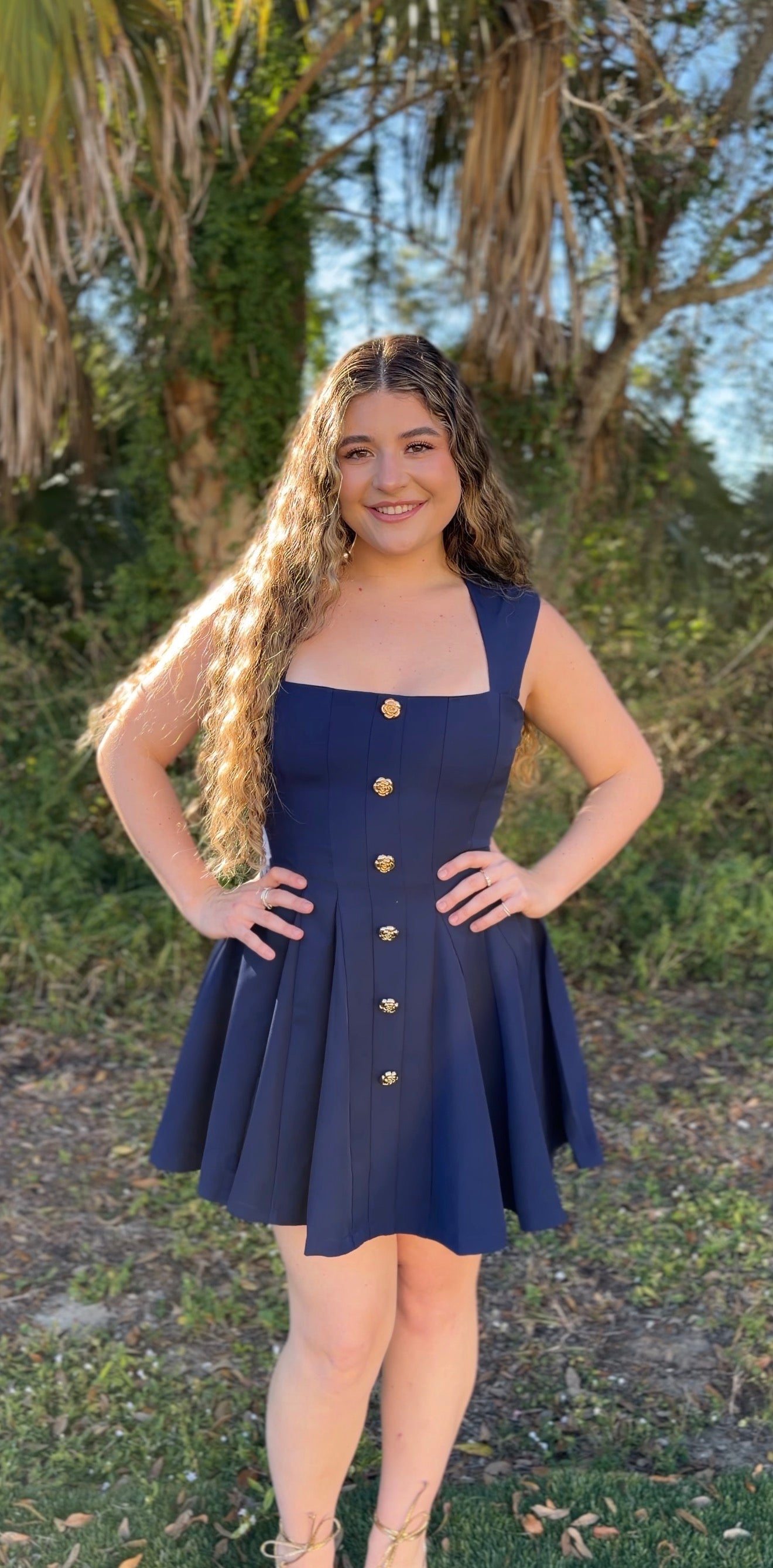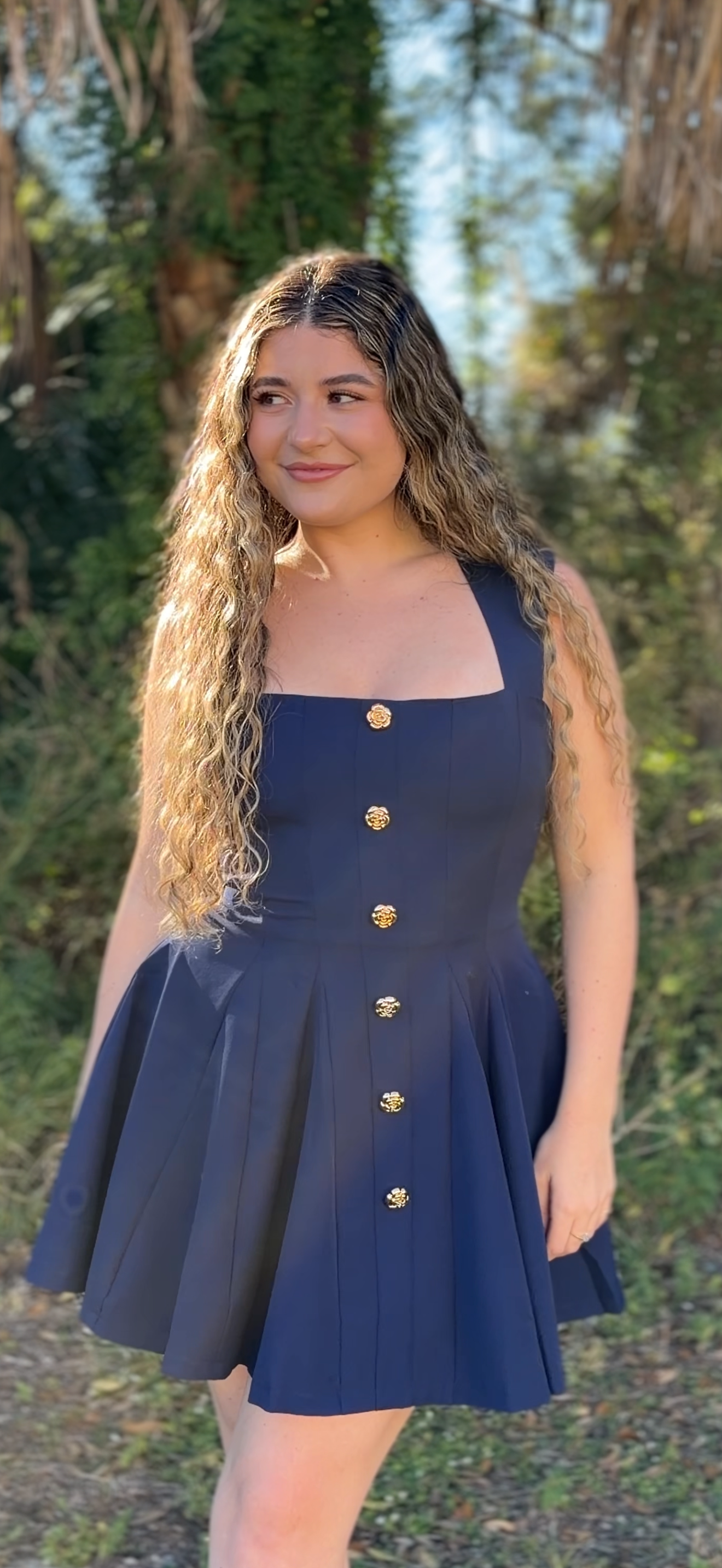The Hayes Mini Dress is a structured navy mini with a square neckline, wide straps, and a fitted bodice that flares into a soft skirt. Finished with gold rose button detailing down the front, a hidden back zipper, and full lining for a polished, flattering fit.