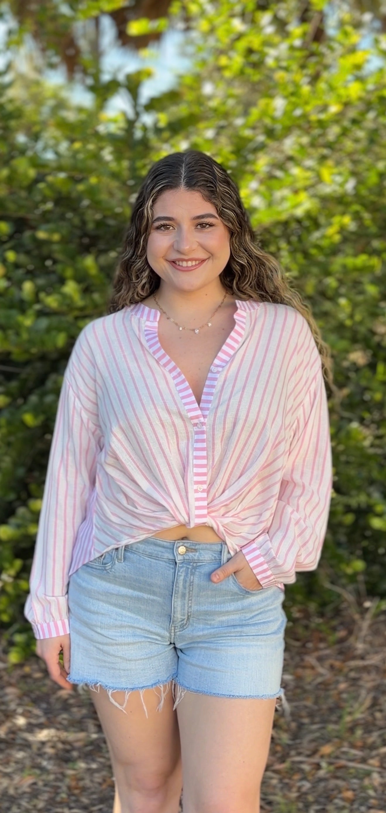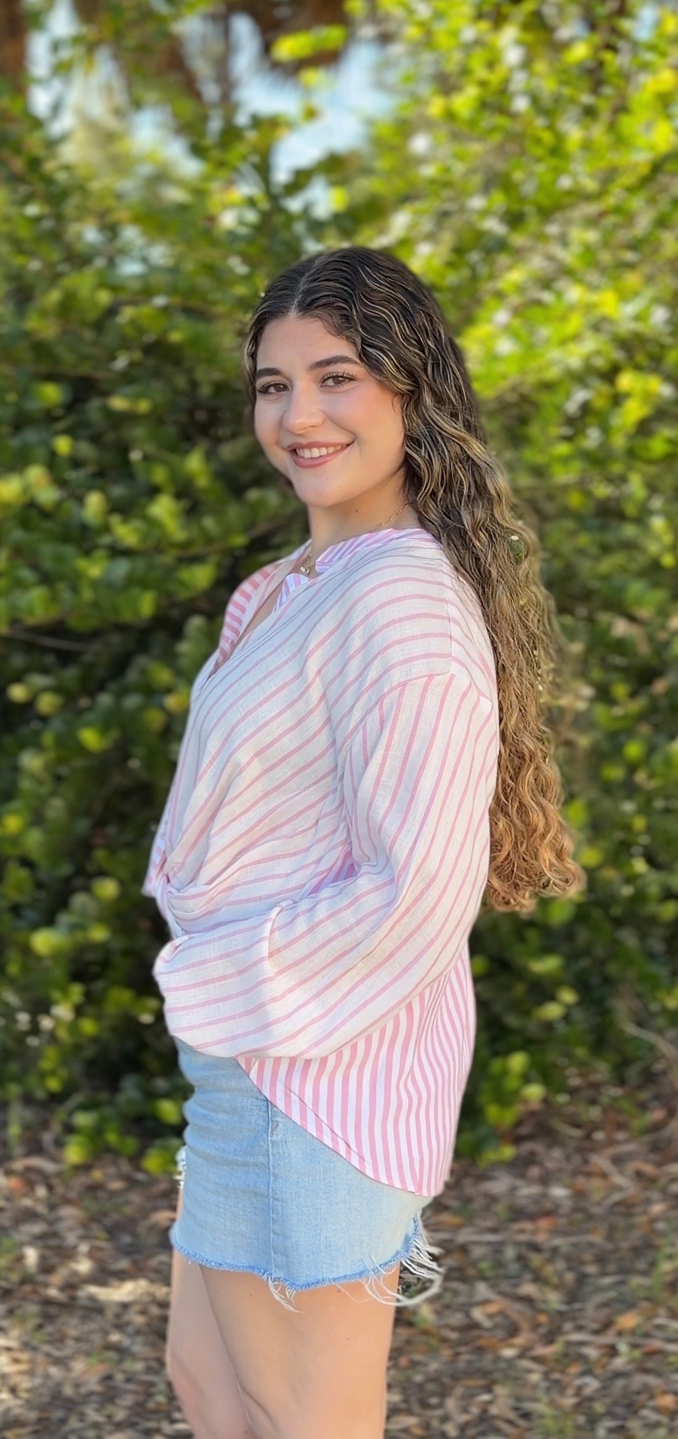Lightweight and effortlessly feminine, the Monte Top features a soft white base with blush pink vertical stripes for a polished coastal feel. Designed with a flattering twist-front detail, split neckline with button accents, and relaxed long sleeves with button cuffs, this sheer woven blouse drapes beautifully with a subtle high-low hem. Easy, breezy, and perfect styled with white denim or cutoffs.