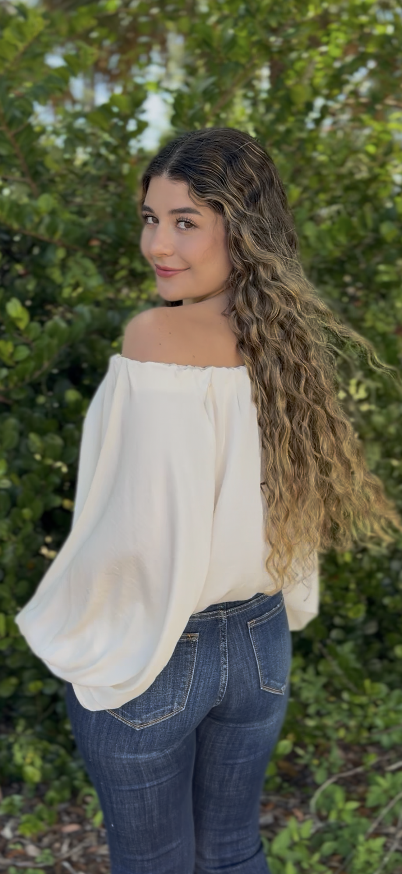 Effortlessly romantic with a touch of drama, the Catrice Top is designed to make a statement. Featuring a soft off-the-shoulder neckline with delicate gathers, this flowy silhouette drapes beautifully for an elevated yet relaxed look. The voluminous long sleeves add movement and elegance, while the lightweight, silky feel makes it perfect for everything from casual denim days to dressed-up evenings.
