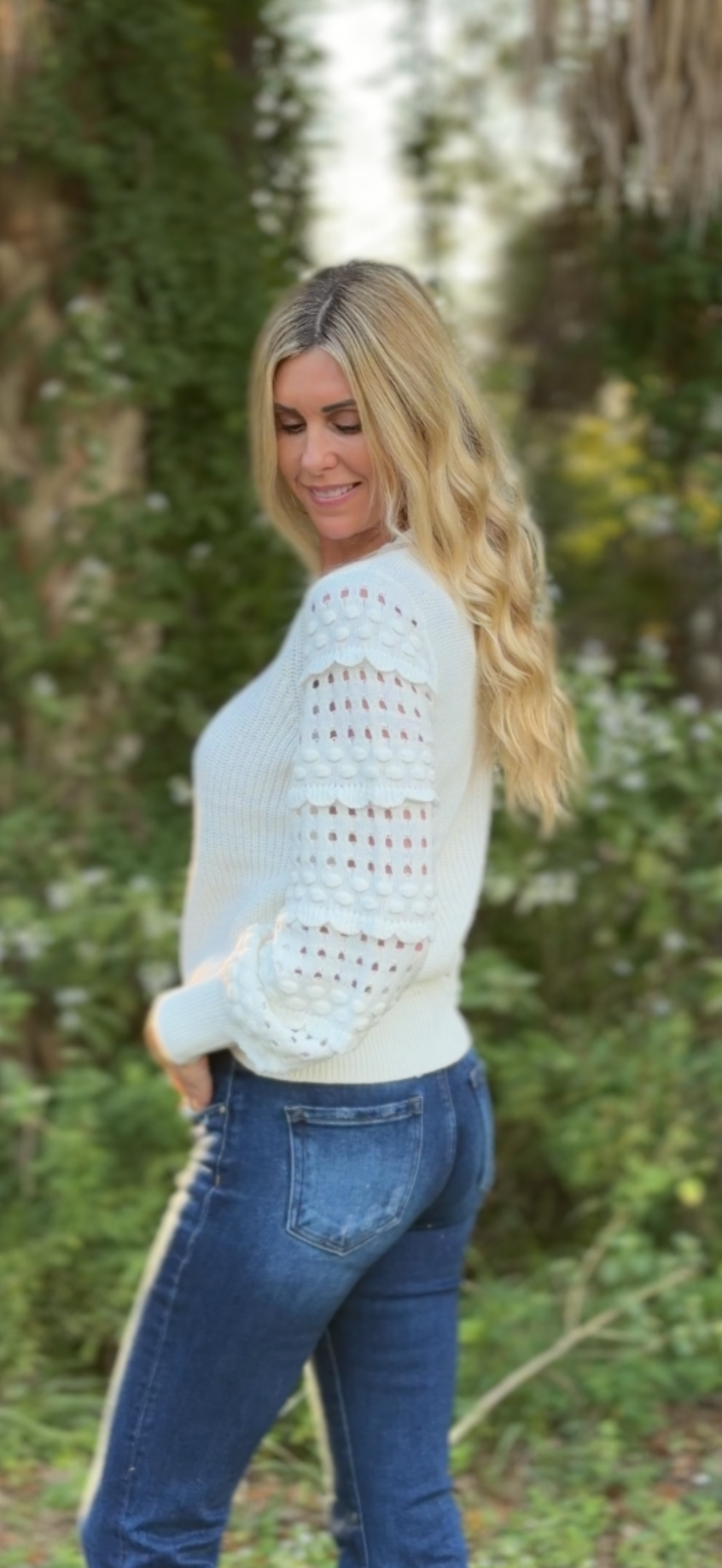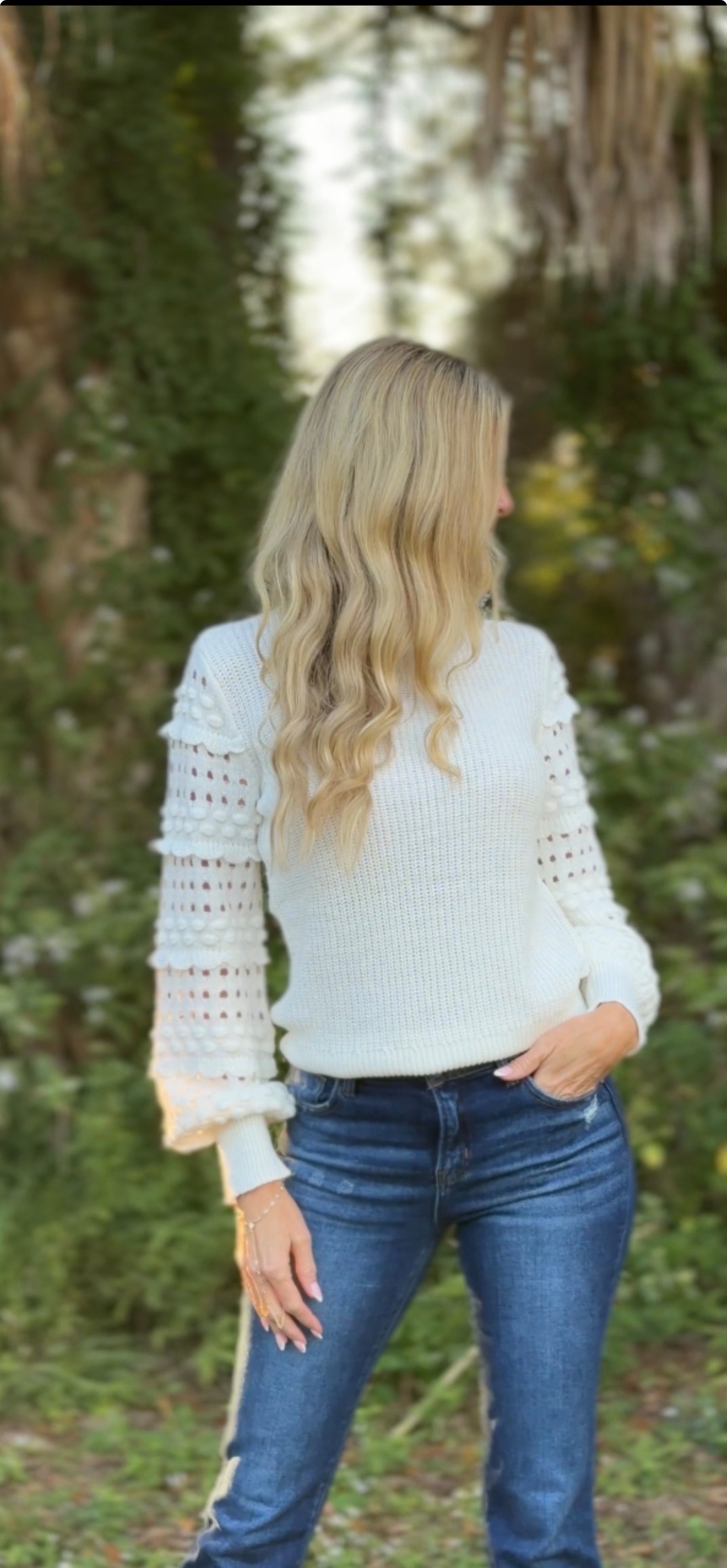 The Frida Sweater blends cozy comfort with eye-catching detail. Its soft ribbed knit body keeps things classic, while the sleeves add a statement twist with airy open-weave crochet panels and textured pom-stitch accents. Feminine, unique, and easy to style, Frida brings the perfect touch of charm to any cool-weather outfit.