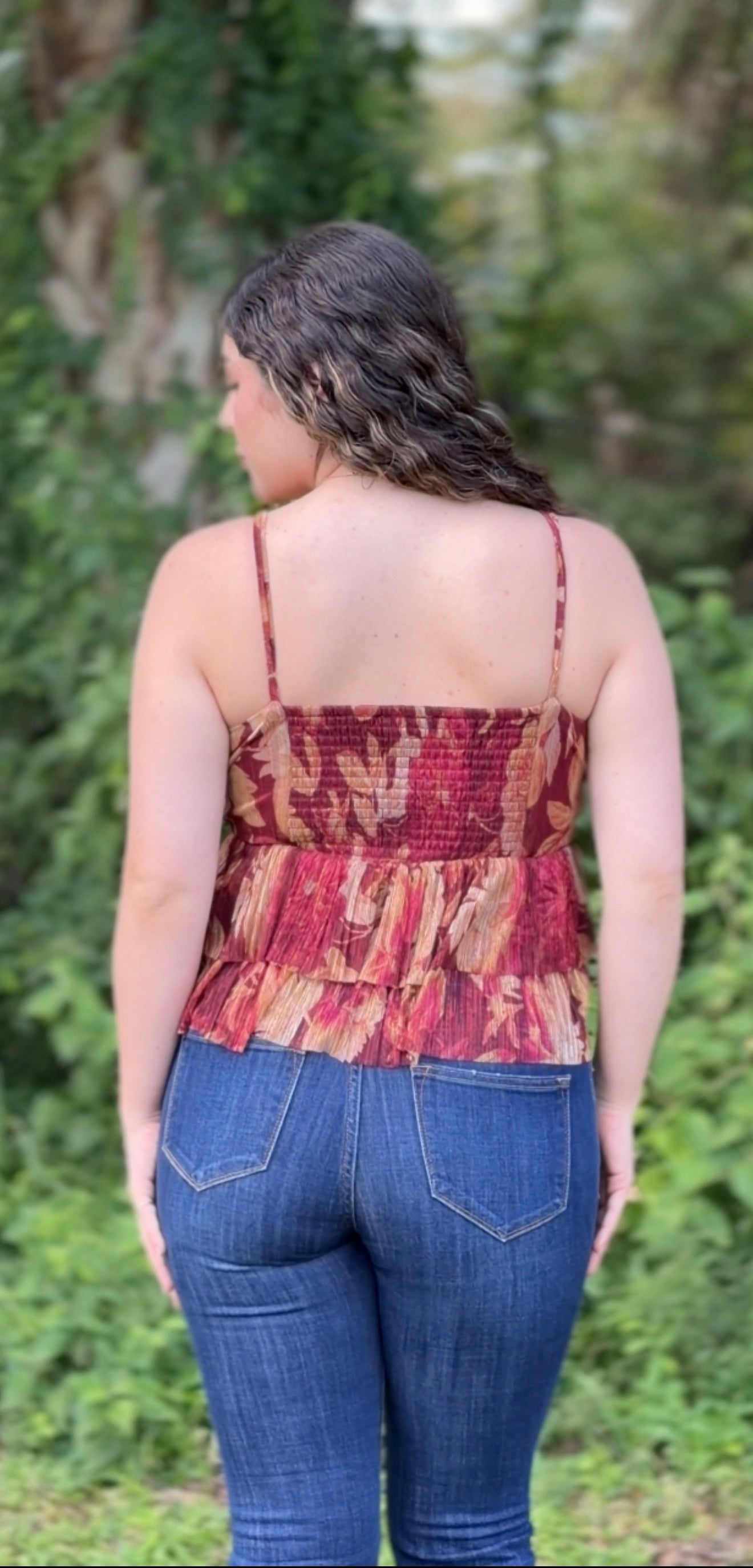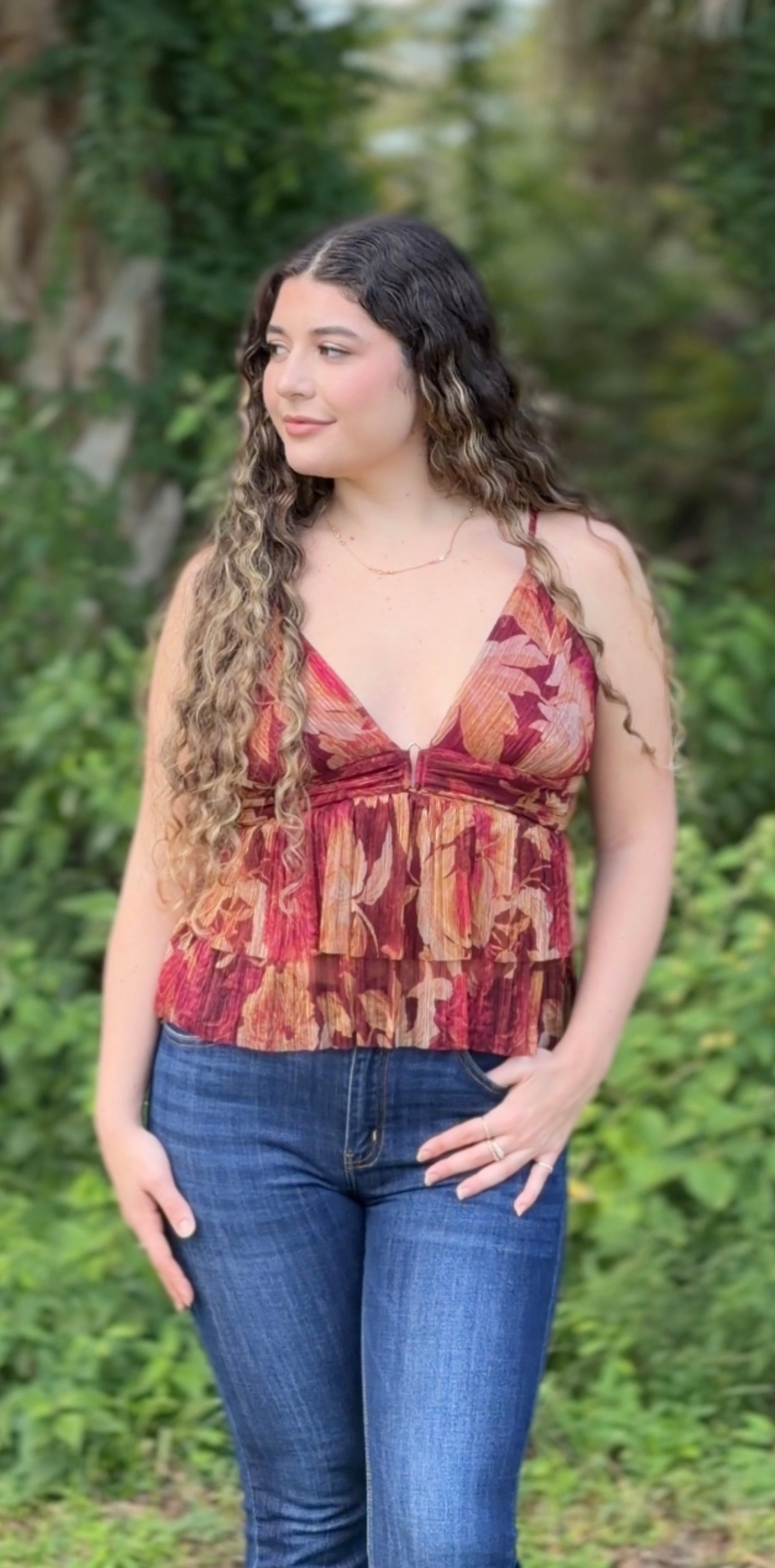 Turn heads in the Crimson Night Top, a striking blend of bold color and feminine detail. Designed in a rich crimson gold print, this cami features a daring deep V-neckline with a ruched center accent, framed by delicate adjustable straps for the perfect fit. The tiered pleated bodice adds movement and dimension, giving the top a playful yet elevated finish.