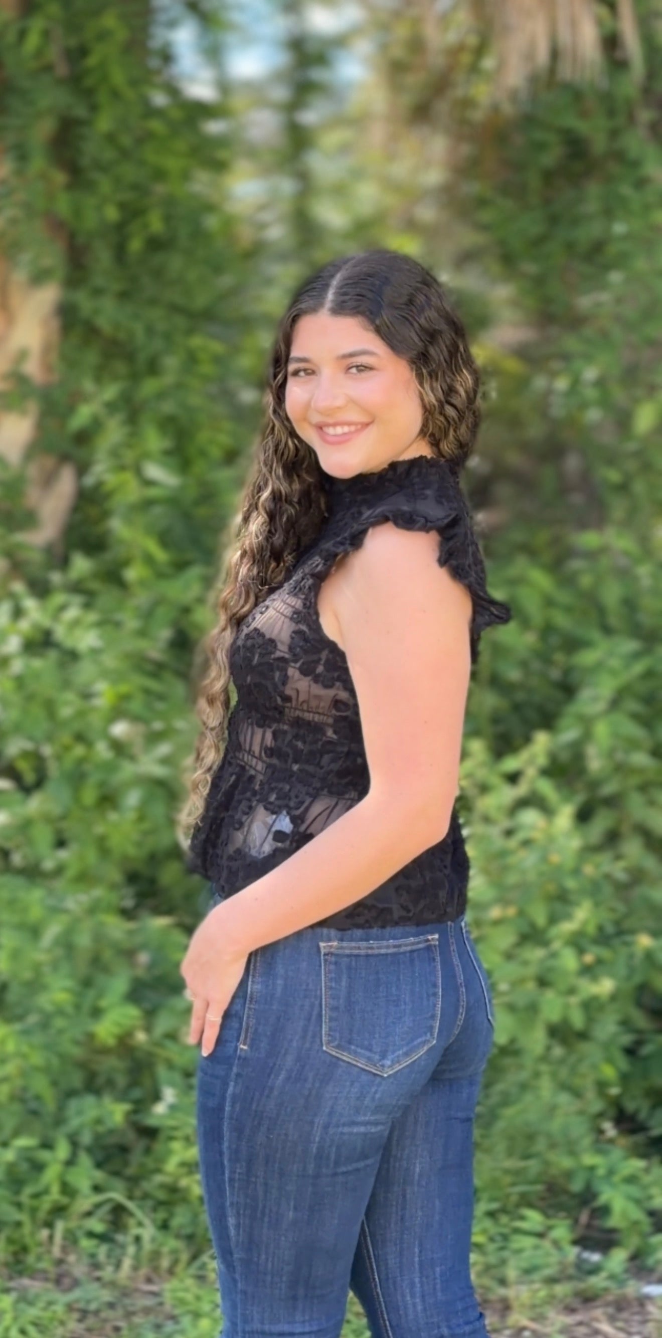 Elevate your wardrobe with the romantic charm of the Maisie Top. Designed in a sheer lace base with soft velvet embroidery, this blouse balances elegance with modern edge. The high ruffled neckline and delicate flutter sleeves add a touch of femininity, while the smocked bodice creates a flattering, form-skimming fit.
