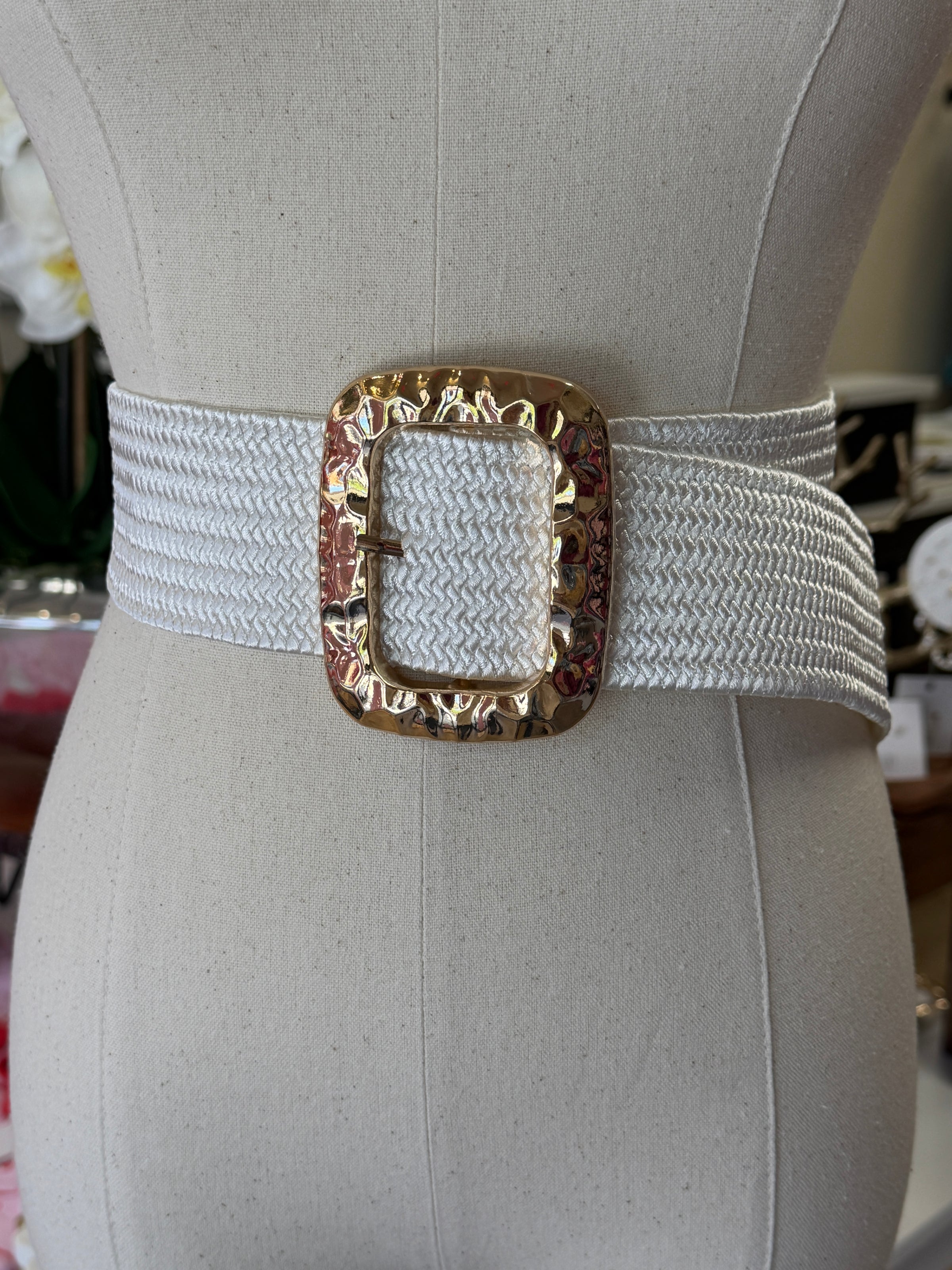 Bring effortless coastal polish to any look with the Shoreline Woven Belt. Featuring a crisp white woven stretch band and a textured hammered gold buckle, this statement belt adds just the right amount of shine while comfortably defining the waist. Perfect for styling over dresses, rompers, or flowy tops, it’s an easy finishing touch that elevates both casual and dressed-up outfits.